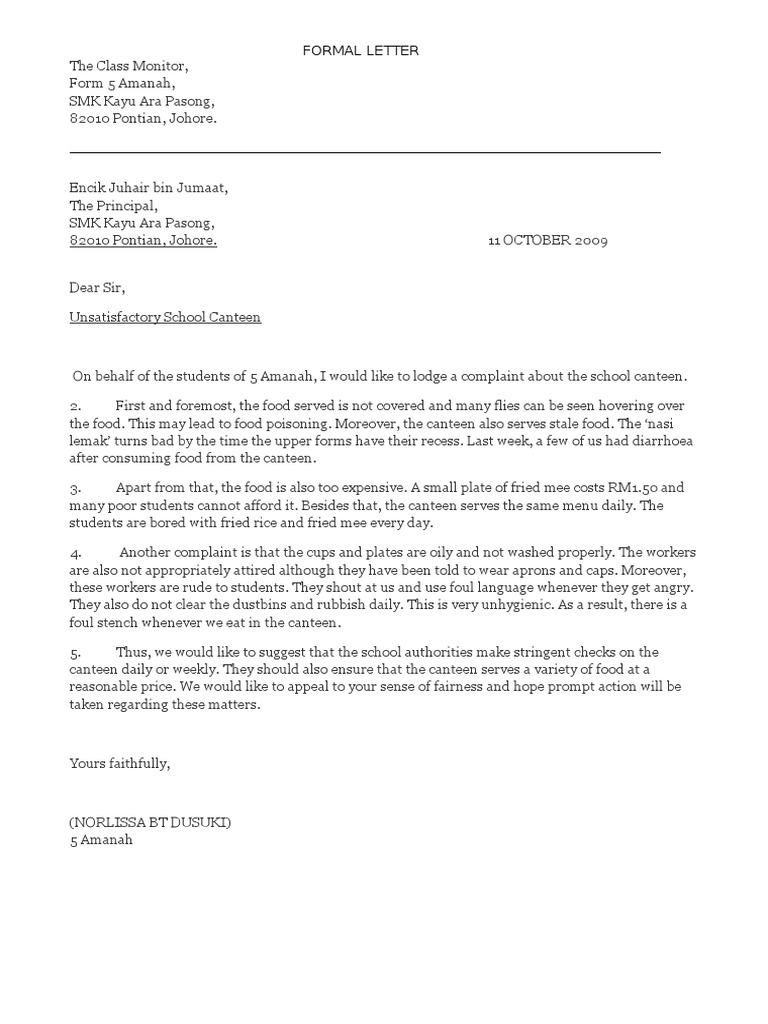 Complaint Letter To School Principal About Food Templates At Allbusinesstemplates Com