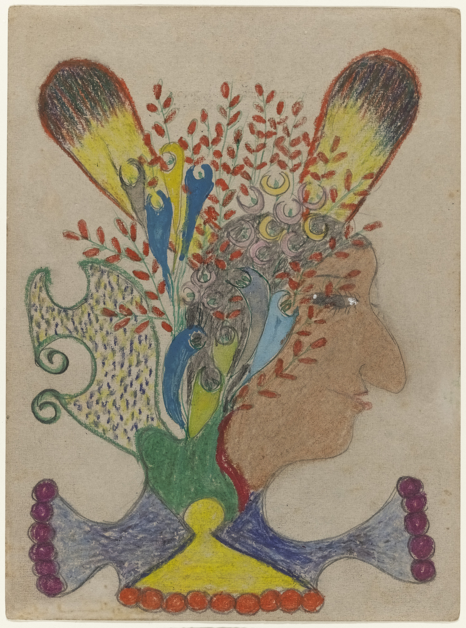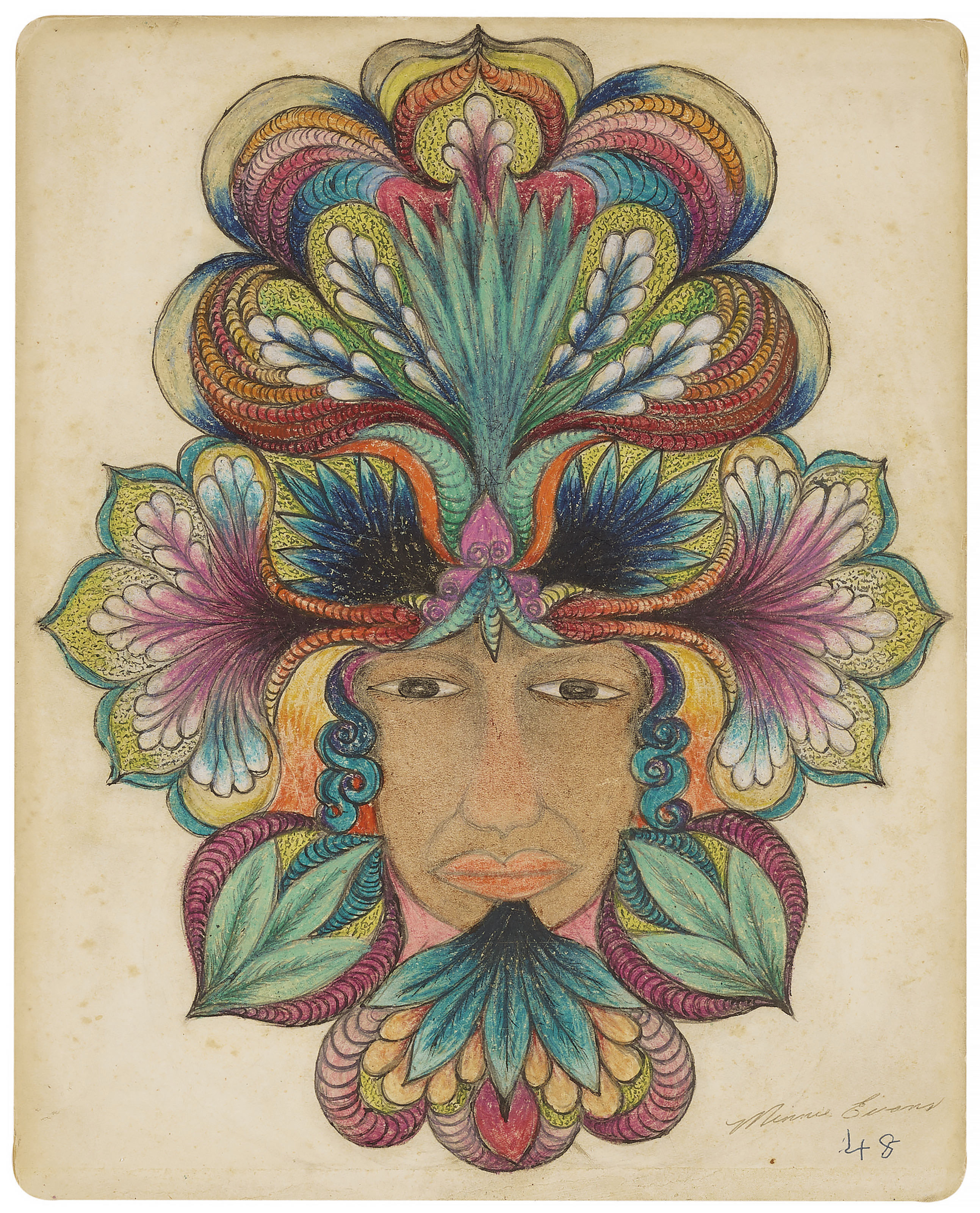 Minnie Evans (1892-1987) | Untitled (Woman with Floral Designs), 1948 | Drawings & Watercolors | Christie's